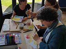 Teilnehmerinnen mit Unterstützung von der Teilnehmerin Anja Schnell u.a. kreativ mit